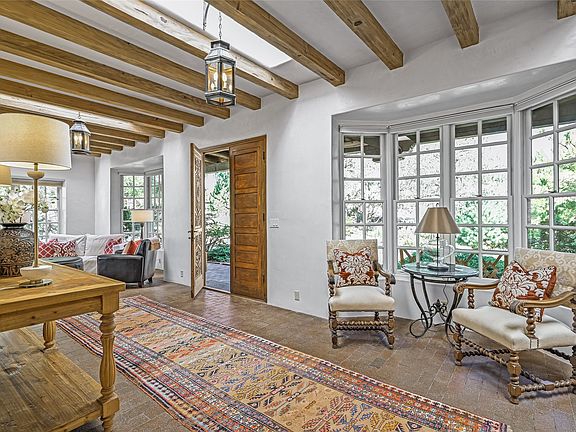 This classic Pueblo-style home with expansive views embraces symmetry and elegance, blending historic character with modern comforts. Inside, 4 fireplaces, brick and wood floors set a warm foundation for three generous living spaces, one of which could easily transform into a private third bedroom suite. Coved ceilings and architectural detailing add refinement throughout.