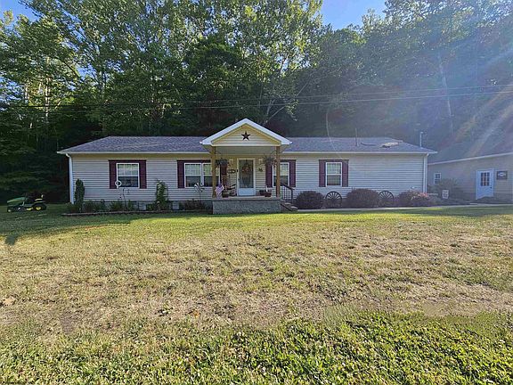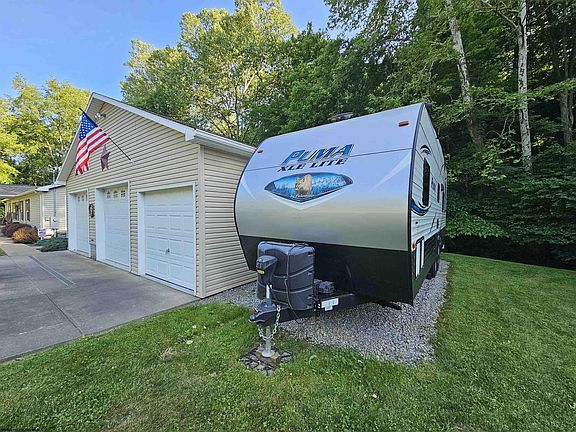 This beautiful natural setting of 2/3-acre offers nicely landscaped level lawns bordered by a relaxing stream and fabulous wooded views as seen from the private and spacious rear deck. Built in 2003, this well-maintained 3-bedroom, 2-bath home offers 7 principal rooms including a 20x12 kitchen with island, formal dining room & 2 living rooms, one with a corner stone fireplace. The primary bedroom suite has a full bath with garden-tub, shower & tile floors. The detached (33'4x26'8) 3-stall garage has electric, water, phone, cable, and plenty of driveway parking in front, and additional RV parking. This is a fabulous park-like setting for making wonderful memories.