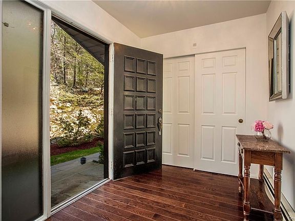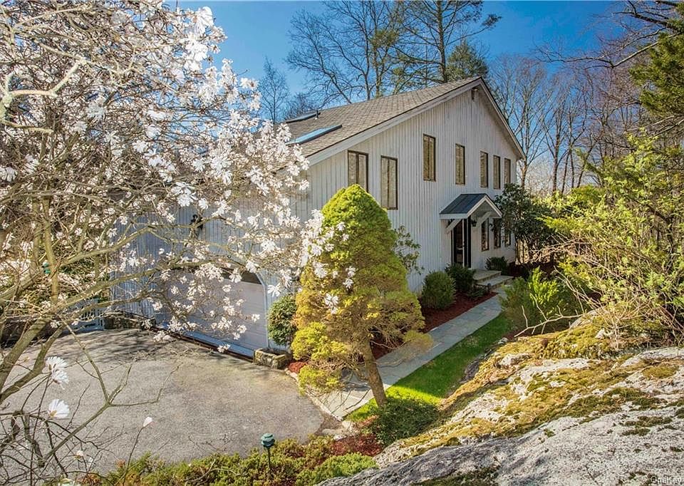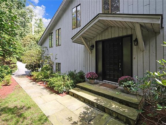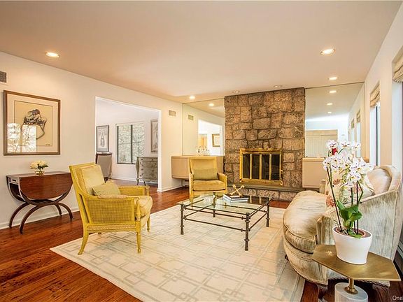 Privately set Contemporary on one acre. Front-facing formal living room w/stone-faced wood-burning fireplace adjoins rear-corner formal dining room, both w/random-width, hand-pegged wood floors. Eat-in Kitchen outfitted w/built-in Sub-Zero refrigerator/freezer, Dacor in-wall oven, GE Profile cooktop, microwave, dishwasher, and slider to main-level deck for easy dining alfresco. Skylit family room w/vaulted ceiling & hardwood flooring. Primary Bedroom Suite w/wall of built-ins, walk-in dressing room & ensuite bath w/Kohler spa tub, steam shower & two mirrored vanities. Three front-facing bedrooms, two of which have built-in desks, and two of which have outfitted closets. Hall bath with wide single-sink vanity & bathtub w/shower. Main level laundry closet & full bath. Walk-out lower-level finished recreation room w/wood-burning fireplace & slider to lower-level deck. Total 3,284 sqft w/finished basement. Lots of storage. Lovely perennial landscaping creates a serene, private setting.