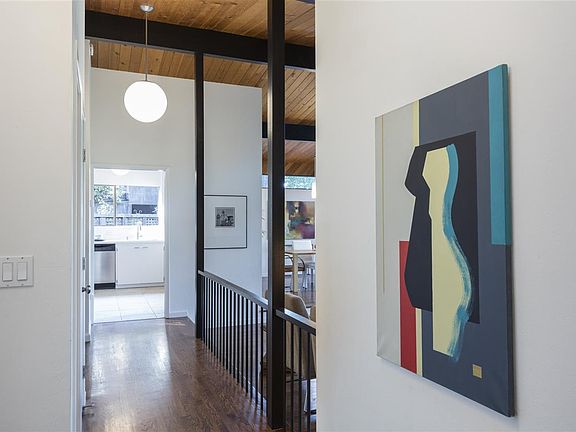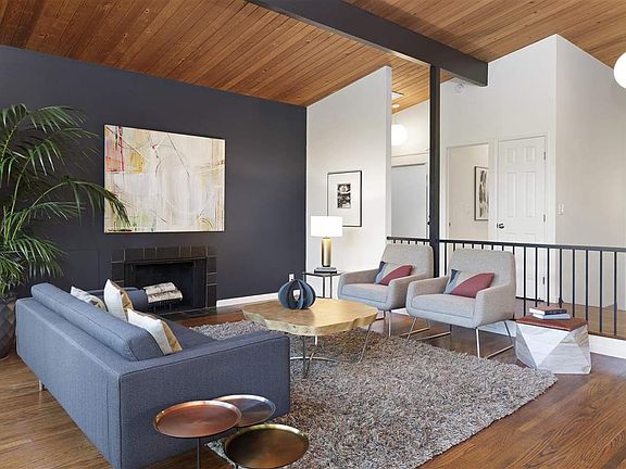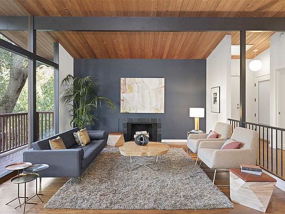 Walls of windows highlight the expansive canyon views from this beautiful Claremont home. Features large architecturally interesting rooms with beamed ceilings, a sunken living room/dining room combination with a deck off the living room and lower family room. There is a wood-burning fireplace in the living room and a wood stove in the family room. Hardwood floors gleam throughout. The master bedroom is large and inviting and has a huge closet. There is tons of storage, a laundry/utility room, and two additional large bedrooms downstairs. The garage features interior access, easily fits two large cars and has an electric car charging station! The large gentle downslope yard could be terraced, and provides a peaceful and green backdrop to the many windows of this warm, woodsy and invitingly modern home.