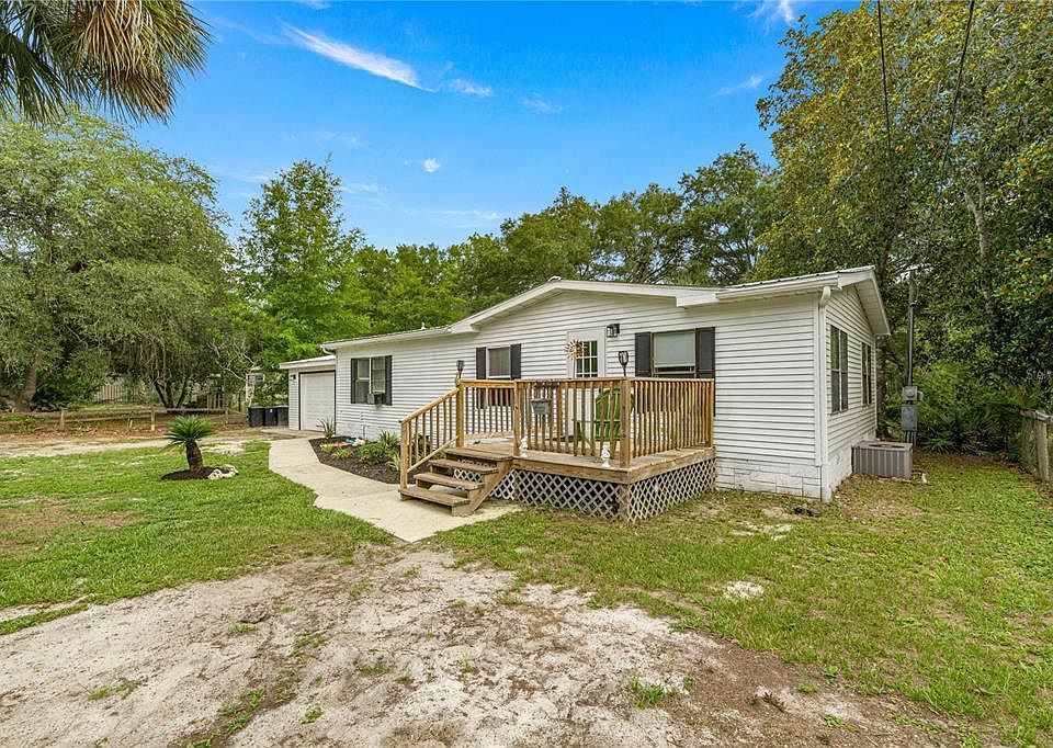 Discover comfort and convenience in this updated 2 bedroom, 2 bath manufactured home nestled in the peaceful community of Fort McCoy. Perfect for year-round living or a weekend getaway, this property offers the charm of country living with practical upgrades throughout. Step inside to find a freshly painted interior, brand-new flooring, and a spacious open floor plan—ideal for entertaining or simply relaxing at home. The inside laundry room adds convenience, while the attached single-car garage offers secure parking and extra storage. A wheelchair accessible ramp has also been added to the back of the home. Step outside to enjoy the back deck, complete with a wheelchair-accessible ramp, making this home more inclusive and accommodating for all. . A second full laundry setup in the shed, along with an RV hookup, making this property perfect for guests or travel enthusiasts. The newer roof adds peace of mind, and the central heat and air system keeps the home comfortable year-round. The current owner notes that using room A/C units has been more cost-effective for cooling. Located near natural springs, lakes, and outdoor recreation, this home offers the best of Florida living without the high price tag. Don’t miss this unique opportunity—schedule your private tour today!