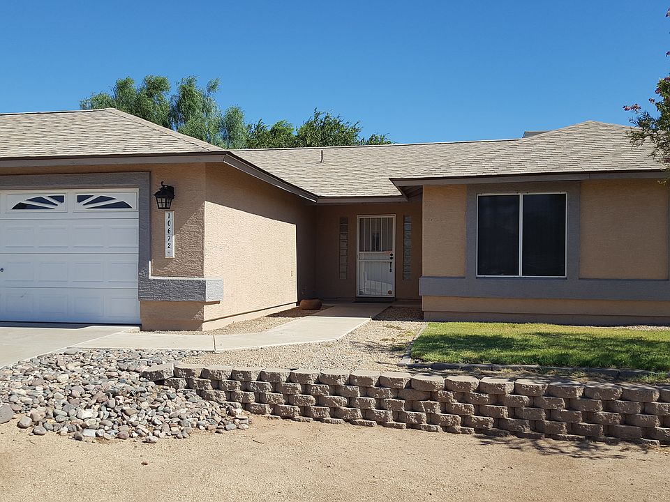 3 bed + office 2.5 bath 1 level charming horse property on 1-acre fenced lot with horse stalls, tack room, irrigated pasture and shade trees. Large covered back patio great for entertaining. Kitchen updated with new granite slab counters, designer backsplash, newer dishwasher and microwave. Bedrooms have new carpet. Bonus 259 sq ft office with half bath and separate entrance. Newer paint inside and out. 2 car attached garage, 2 detached shops approximately 18'x28’ and 14'x21’. Raised garden beds and chicken coup. Pebbletec play pool with safety fence and netting. No neighbors behind you. New roof 2018, new water heater 2017, new heat pump for office 2017. Convenient to the 101 loop, Westgate, Cardinals Stadium and Spring Training. Lots of room for your toys. Come and make this home your own.