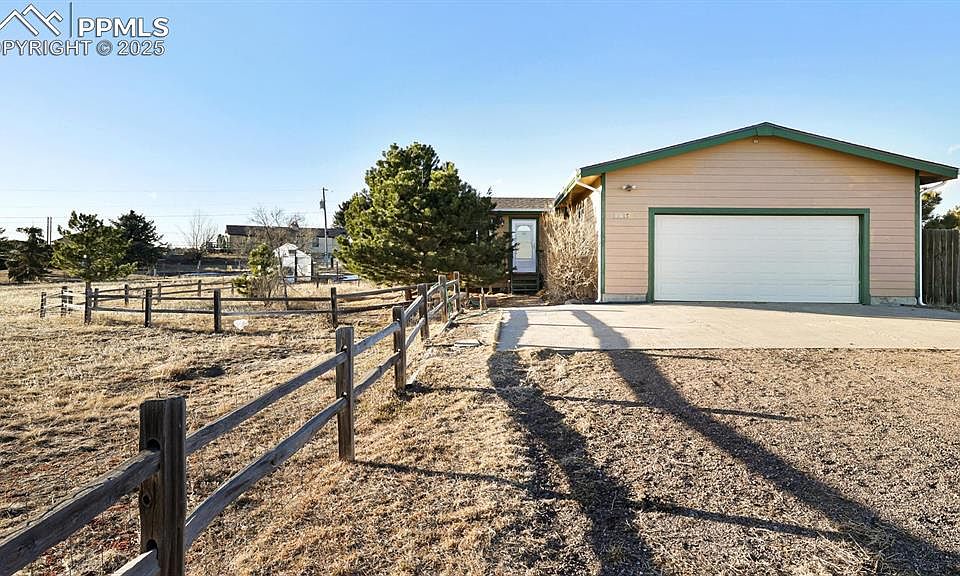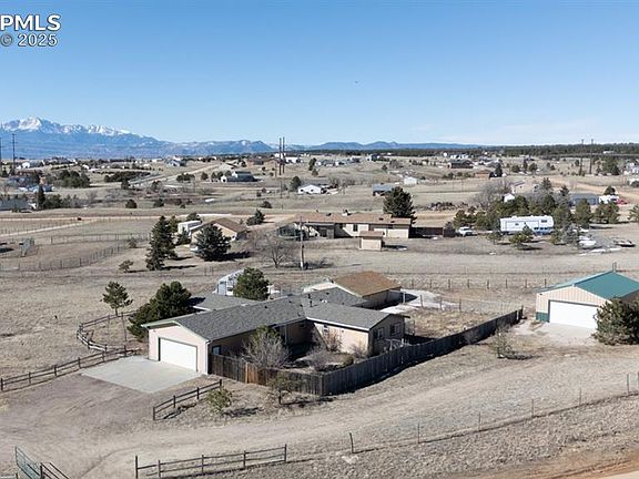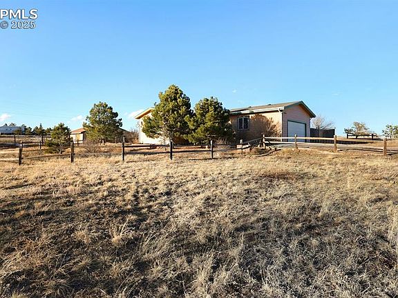 Nestled in the serene Peyton neighborhood of Paint Brush Hills, this beautifully designed 4BR, 3BA ranch-style home sits on a horse-zoned 3.04-acre lot, offering breathtaking views of the mountains & Pikes Peak. With 1,986 sq. ft. of thoughtfully planned living space, this home provides the perfect blend of comfort & functionality, all on one convenient level. Step inside to an inviting open floor plan filled w/ natural light from skylights. The spacious living room features neutral carpeting & an electric fireplace, perfect for cozying up on chilly evenings. A large dining room is ideal for hosting family & friends, while the eat-in kitchen boasts a dining nook w/ direct access to the attached garage. The kitchen is well-appointed w/ ample wood cabinetry, generous counter space, & stainless steel appliances, including a smooth-top range oven, built-in microwave, dishwasher, & refrigerator. A separate Butler’s Pantry adds extra storage, a built-in planning desk, and a pantry for added convenience. The primary suite is a private retreat, complete w/ double mirrored wardrobe closets, a cozy window seat, & an en-suite bathroom featuring a dual-sink vanity & a large walk-in shower. 3 addtl BRs provide flexible space for family, guests, or a home office, & they share a shower bathroom, & separate full bathroom w/ vanity, mirror, & tub/shower. Laundry closet w/ washer & dryer that stay. The property includes an attached 2-car garage as well as a detached garage/workshop w/ 220-amp service, perfect for hobbyists. No HOA. RV or small boat storage available. Outdoor features inc a paver patio, a fenced dog run, an electric & split-rail fence, outbuilding, & greenhouse for growing your own plants, fruits, & vegetables. Enjoy peaceful country living w/ city conveniences just minutes away. Multiple parks, walking trails, & Antler Creek Golf Course are all within close proximity, offering ample recreation & entertainment. Don't miss the opportunity to own this delightful home.