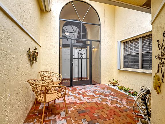 Beautifully renovated villa with Courtyard entry in exclusive gated 55+ community with paver driveway & 2-car garage. This immaculate home features a dream kitchen with newer SS appliances, custom cabinets & granite counters. Both bathrooms are recently renovated. The primary bathroom has dual sinks, a spa tub & separate shower. Bedroom closets are fitted with custom shelving. The living room & dining room shades operate on a remote control. This home has full hurricane protection with accordion shutters & high impact garage door. There are pull down steps for attic storage & a generator for the house with a special electrical outlet. Enjoy peaceful water views from the Florida Room. Clubhouse is currently under renovation with no assessment and should be completed in February 2025.