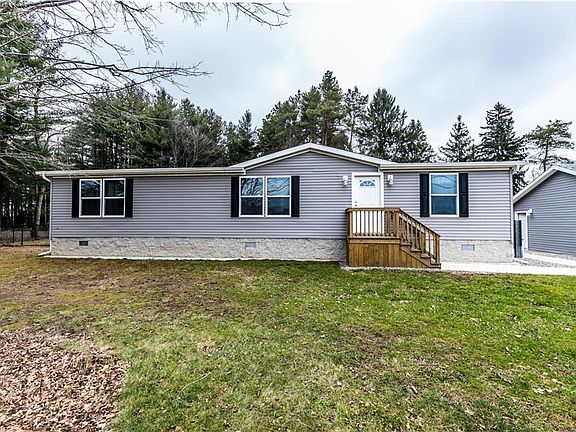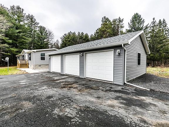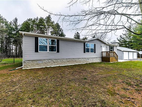 Fantastic practically NEW manufactured home on more than 6 acres of country land that's not far from the city. The land is mostly mature woods except the area around the house of which a large part of the back yard is fenced with a commercial-grade fence. The home has 3 bedrooms including a master with a walk-in closet, bath with tall double vanity & large linen closet. The master is on one end of the house adjacent to the kitchen that features a MASSIVE island that would be amazing for entertaining, plenty of counters & a spacious walk-in-pantry. There's room for a large dining table at the end of the kitchen which is open to the living room. At the back of the house is a laundry room/mud room where you can access the huge backyard & new concrete patio & SO much room to play. At the other end of the house are two more bedrooms & a full bathroom. Outside is a 3-bay garage where you could keep vehicles protected from the weather and still have a workshop or hobby area. There is an attic space over one bay that's accessible via pull-down stairs. A play house is beyond the fence in the back and the seller has successfully hunted the property for years. Ask about the 0% down USDA loan!