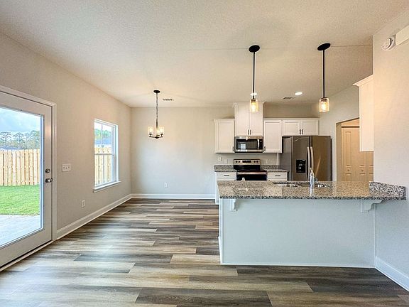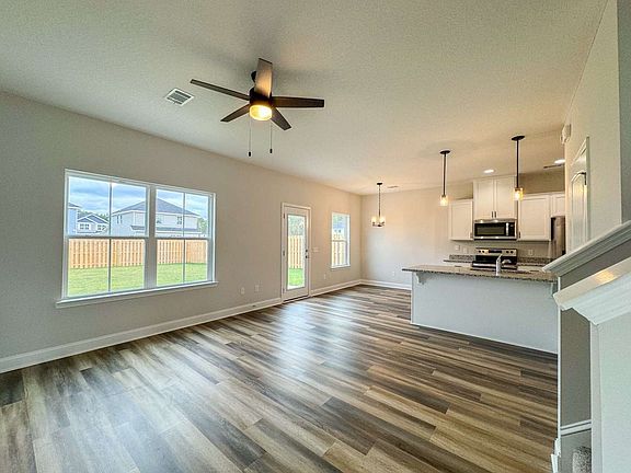 Estimated completion October 2023. Gaston plan in Griffin Park of Hinesville! Situated in a central location in Hinesville near local shopping & dining within minutes of Ft. Stewart! Two-story home with open-concept living space on the first floor. Upon entry into the home, take in the open family room with plank flooring & a views into the fenced, sodded & irrigated backyard. From the family room, the home transitions to the kitchen & dining area. The kitchen features granite counters with white cabinetry & a large pantry. Access your 2-car garage from the kitchen as well. A half-bath is also located on the first floor. Upstairs, access 2 bedrooms, hall bath, master suite & laundry room from a central flex space perfect for a home office or second living space. The master suite features a vaulted ceiling, walk-in closet & private bath, soaking tub, separate shower & dual vanity. Seller offering $5000 towards closing costs with Preferred Lender, exclusions apply.