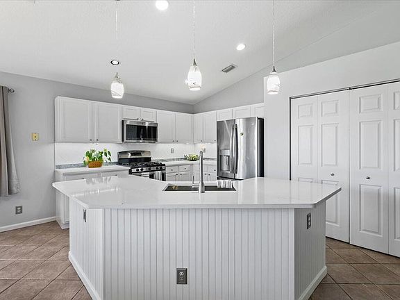 Pool home! 3 bedrooms, 2 bathrooms, and 2-car garage located in Normandy Isles! Beautifully updated kitchen with quartz countertops and SS appliances, both bathrooms have been updated with new vanities and showers, and the interior has been freshly painted throughout. Master suite has a large soaking tub, separate shower, two walk-in closets and sliding glass doors that lead out to the back patio. Full hurricane protection with accordion shutters, 2018 roof, brand new hurricane rated garage door, large screened-in patio and pool area, and a fully fenced in backyard with a beautiful rock water fountain feature. This community is on natural gas, and the home has a gas stove, dryer, water heater, and outside hookup for a grill. Low HOA fees!