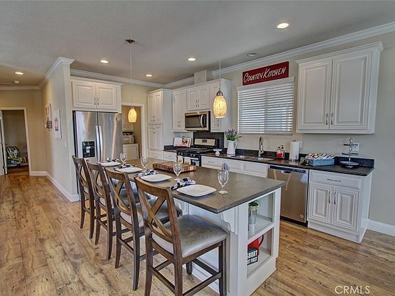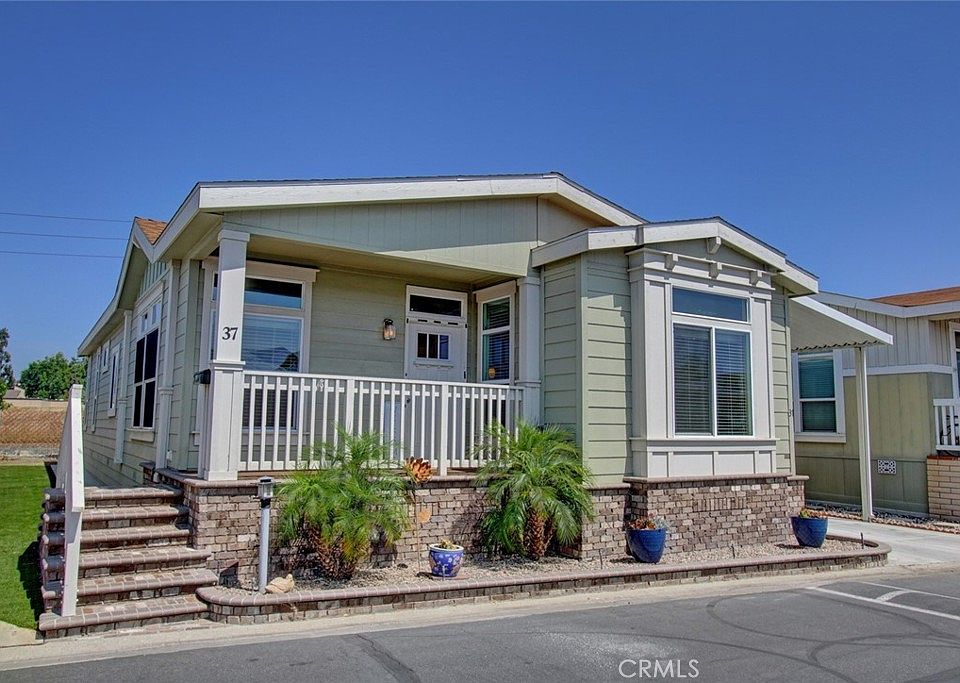 Wonderful Senior Living in Royal Oak Mobile Park located in Los Alamitos. Beautiful Brickwork and Steps leading to a Lovely Covered Front Porch. This Beautiful Home welcomes you with 9' Ceilings, Open Concept, Living Room with Coffered Ceiling, Ceiling Fan, Window Valances and Laminate Flooring. Shows Light and Bright, features Transom windows in the Living, Dining and Kitchen areas. The Kitchen features Recessed and Pendant Lighting, Large Island, an array of Cabinetry, Stove, Microwave, Refrigerator and Dishwasher. Living Room boosts Laminate flooring throughout with a Wide Hallway to Office and Bedrooms. Bedrooms and Office feature Carpeting and Ceiling Fans. Master Bedroom also with a Coffered Ceiling, Ceiling Fan and Closet. Adjacent 3/4 Bath features Walk-In Shower with Glass Doors and Walk-in Closet. Inside Laundry Room with Walk-In Pantry, Washer adn Dryer, Central Air and Heating, Blinds Throughout and Automatic Sprinklers in the Front. Covered Carport features a Shed with plenty of room for an Outdoor Patio/Seating Area. Side yard with Artificial Grass and a Backyard Great Size for a Garden of Vegetables or Garden of Flowers! Coyote Creek Park is located behind the home with a Bike Path nearby to ride along down to the Beach, walk your dog or just take a stroll through the neighborhood. The Los Alamitos Senior Center is within Walking distance. Royal Oak Community amenities feature a Pool, Spa, Patio Area, Clubhouse with Kitchen and Game Rooms for your enjoyment. This home is truly a must see.