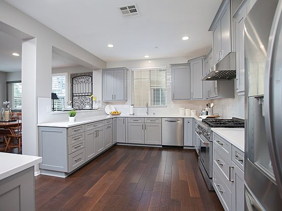 Will entertain offers between $949k & $979k. End unit with lots of light. This is one of the most upgraded homes in development w/newly remodeled chefs kitchen featuring shaker style cabinetry, stone counters, stainless appliances & custom backsplash. There are wood floors throughout the home, custom paint & window shutters, additional cabinets in laundry & half bath, custom built-ins in closets & pantry & an extra wide garage w/ sturdy storage cabinets. Walking distance to Sage Canyon Elementary!