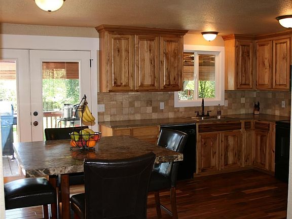 Beautiful fully remodeled home on nearly 1/2 acre. The inside has solid wood interior doors, Rustic Hickory cabinets, scraped Teak wood floors, large living space up stairs and down stairs. Beautiful custom built mantel. The outside features a large covered deck, lots of garden area, large mature trees, with a Childs dream tree house, several fruit trees. Fully fenced. RV parking with 12 foot gates to back yard. Lots of custom wood work both inside and outside.