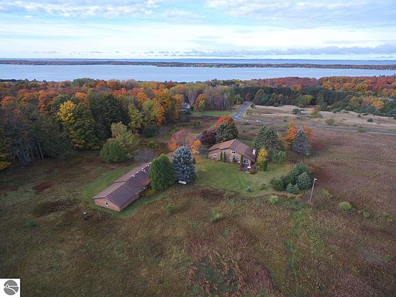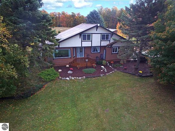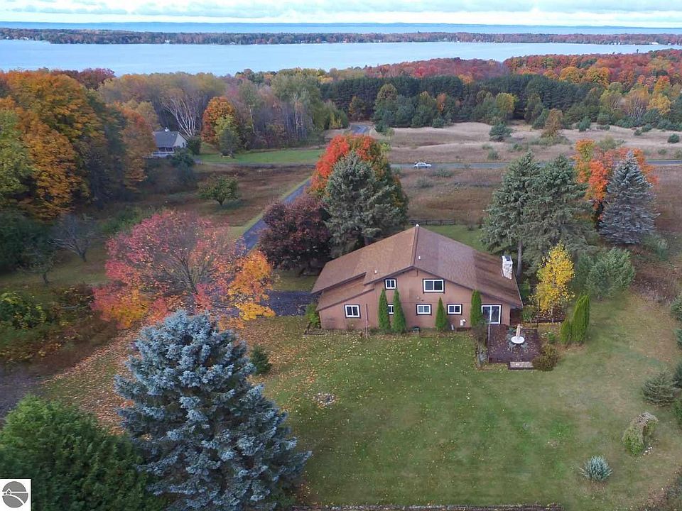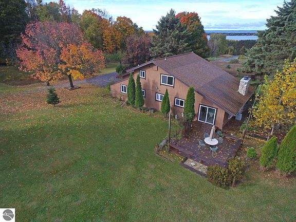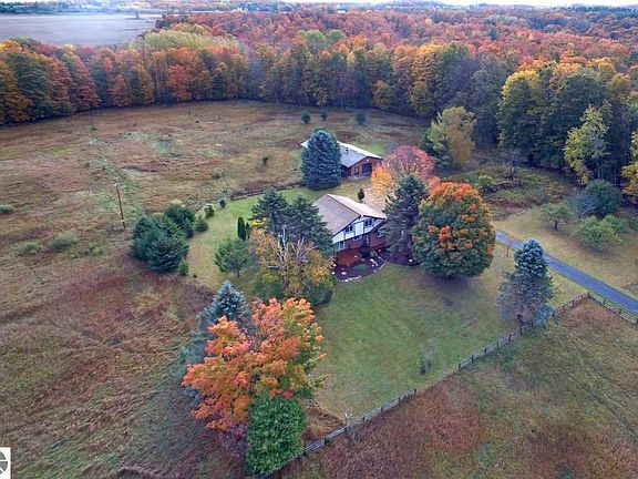 A 10 ACRE SETTING with beautiful views of the surrounding countryside, Torch Lake & Grand Traverse Bay. Wonderful family style home featuring a gorgeous stone fireplace in the spacious living room; 4 bedrooms, 2 baths; main floor laundry; attached garage with built in cabinets; newer windows and so much more. The remodeled kitchen features solid surface countertops, a large island, tile flooring and dining area. Watch the wildlife from the deck while enjoying your morning coffee. The handyman in your family will love the 30 x 50 heated shop and storage building plus the 30 x 30 three horse stalls with tack room-bring your horses! What a great place to call home!