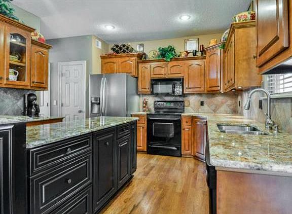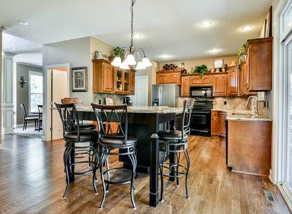 Don't miss this beautiful 2-story LOADED Raven Crest home: Gorgeous stone & stucco finish & barn door style garage doors. Large open floor-plan, stunning kitchen with enormous island, granite countertops, under-cabinet lighting, tons of cabinets, gleaming hardwood floors & two pantry closets! Master suite includes VAULTED CEILINGS, DOUBLE VANITY, HUGE TUB & HUGE WALK-IN CLOSET! Basement features FULL BATH, RETRACTABLE HD PROJECTOR SCREEN & TONS OF STORAGE! LARGE FENCED BACKYARD w/ COVERED/SCREENED DECK & HOT TUB!