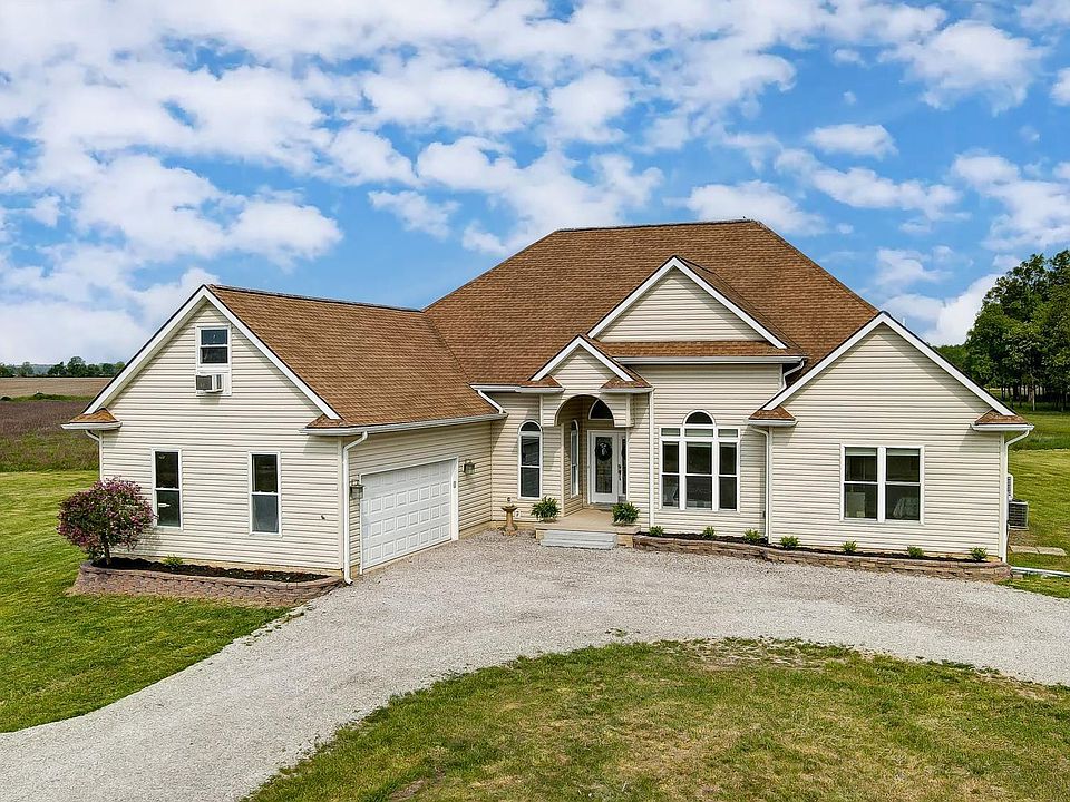 Welcome to your dream home that has it all! This stunning property sits on 10 rural acres with 40 x 60 pole barn (concrete slab). Open, spacious floor plan with 14 ft ceilings and great for family/entertaining. Expansive kitchen with luxurious quartz counters, ceramic tile floors, modernized lighting, new stove and eat in dining overlooking the in ground pool and natural beauty of local wildlife. The primary bedroom en suite is nothing short of breathtaking. 17 x 15 ft. it boasts new carpeting, sitting area and access to deck/pool. Primary bath features Jacuzzi tub, ceramic tile floors and shower, Corian double vanity and huge walk in closet. 14' x 28' fully fenced in ground pool installed in 2016, automatic awning, hard wired security and Pella windows just a few of the "extras". Farm soil is organic farm eligible. Come and immerse yourself in these peaceful surroundings. Robotic pool cleaner does not belong to sellers and is excluded from sale.