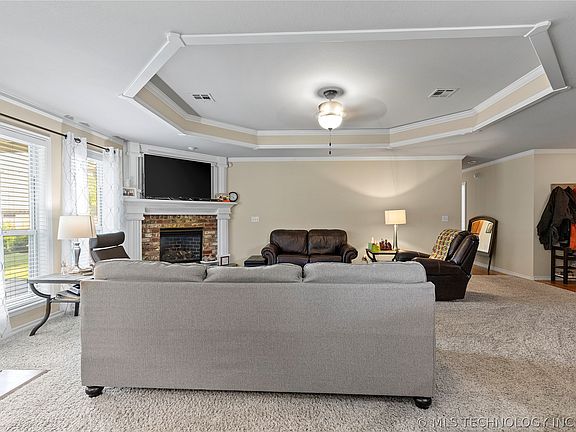 This charming all-brick home offers the perfect blend of comfort, convenience, and energy efficiency. Featuring three spacious bedrooms, each equipped with walk-in closets, providing ample storage space and 2 full bathrooms. Benefit from high energy-efficient thermal windows manufactured in Tulsa, promoting sustainability while reducing utility costs. The newer dishwasher, stove, and microwave add a touch of modern convenience to the well-appointed kitchen, making meal preparation a breeze. 4 year old roof and newer hot water heater. Step outside onto the good-sized covered patio, complete with retractable shades that stay with the property, offering the perfect spot for outdoor gatherings. Explore the nearby trails and park, perfect for leisurely strolls or outdoor recreation. Additionally, two stocked neighborhood ponds offer opportunities for fishing and relaxation. With close proximity to schools and easy access to Highways 75 and 169, commuting and running errands are a breeze, making this home an ideal choice.