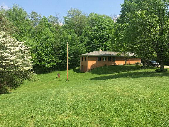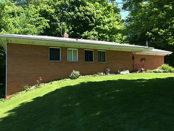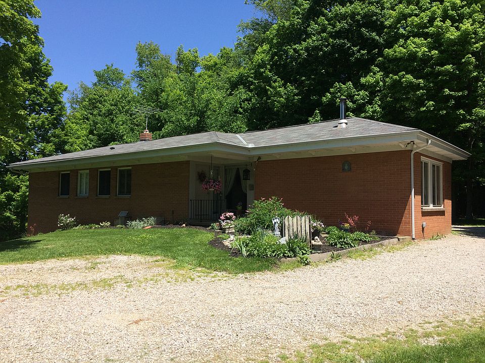 Beautiful, private, brick ranch with unique features on 12 acres with pond. Barn with 3 stalls, another out building, detached 2 car garage, guest house. Wood ceiling and beams in living room and bedrooms. Painted cherry wood walls in main living area. House has 3 bedrooms on main level, with a 2 finished in lower level and 2 1/2 baths. Custom-made Amish kitchen and Amish tongue and groove oak flooring in entry, hall, kitchen, and dining. Original wood flooring in living room and bedrooms. Full basement with walkout entry, canning kitchen in basement and rest may be finished for additional living space.