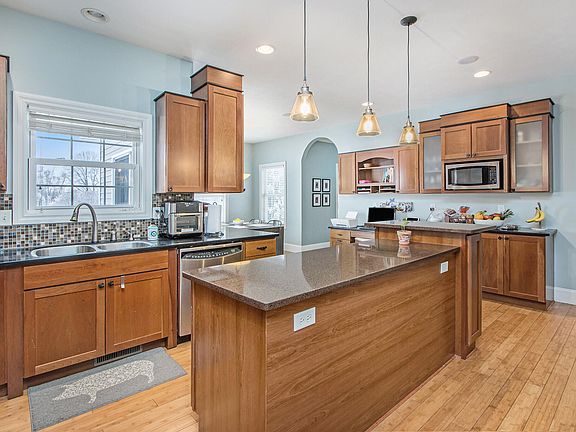 Custom-built home on 1.2 acres in Maplewood Farms Carefully thought out Cherry kitchen includes; stainless steel GE appliance package, double ovens, walk-in pantry, center island, built-in desk. Informal eating area walks out to expansive second-story decking. Ingle nook feat custom built-ins/gas log fireplace. Bamboo flooring throughout much of the main level. Formal dining area off the foyer. Main floor laundry/mudroom with built-in lockers. Light and bright family room with crown molding. Main floor master, walk-in closet custom shelving. Three bedrooms and one full bath on the upper level. Amazing 9ft walk-out basement, loads of windows, full wet bar with fridge and microwave. New roof 2021 - invisible dog fence installed recently tooLower level guest suite with full bath. Excellent storage space including a full workshop with second walkout exit, additional electrical had been added. Enjoy a very nice hot tub, new cover. Numerous upgrades include Kinetico wa