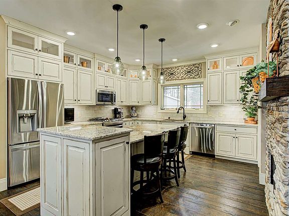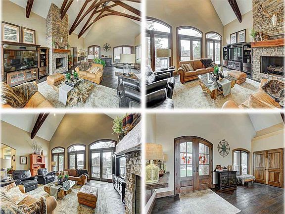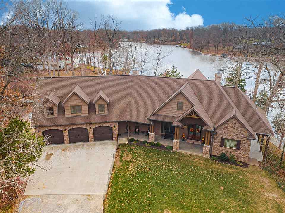 Remarkable is an understatement! You will enjoy all the outdoor activities that come w/living on this lake. This home has been built w/attention to detail and quality materials. Enter into this huge great room w/floor to ceiling stone fireplace, hardwood floors, 24 ft cathedral ceilings w/exposed beams, and breathtaking views of the lake. Walk through the large arched opening into a nice dining room. The beautiful kitchen has a large island, stone fireplace, and quality elder and maple Amish built cabinets. Off the eating area is a sunroom perfect for relaxing. The first floor en suite measures 36' x 14' w/large sitting area. Upstairs there are two bedrooms with built-in dressers, and bathroom. The lower level has a very large family room, a game room, full bath and large office area. There are several outdoor living areas. Extras features include boat dock, 6+stall garage and totally remodeled guest house. This home is less than five years old and sits on 3.25 acres.