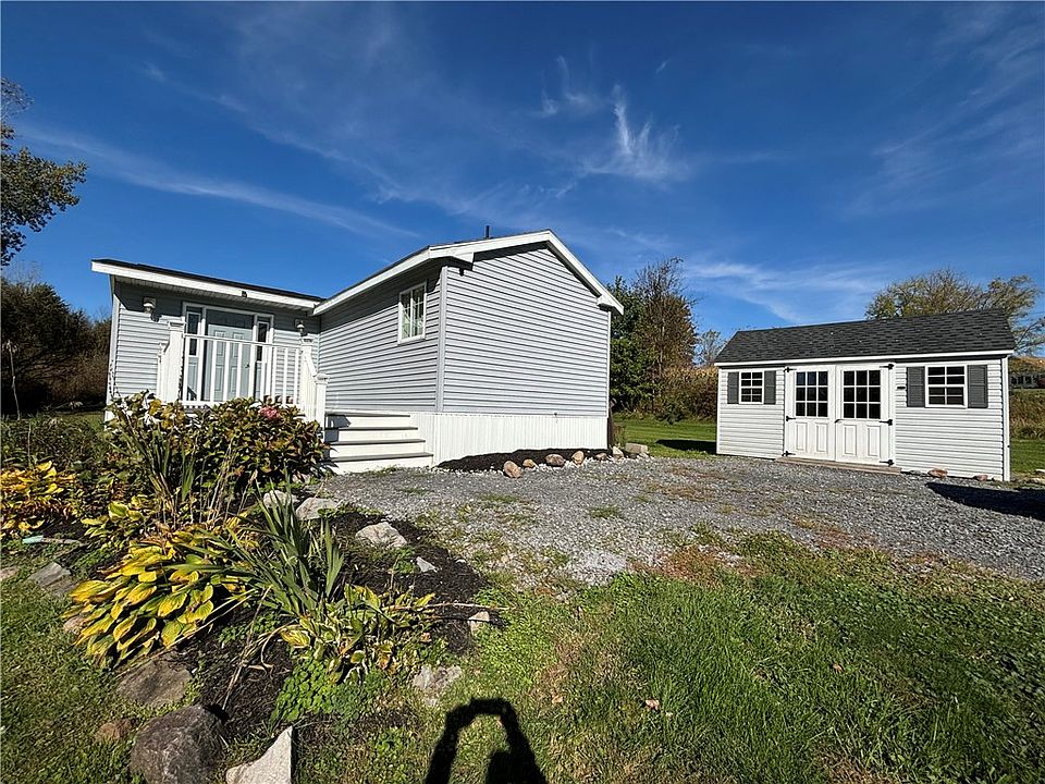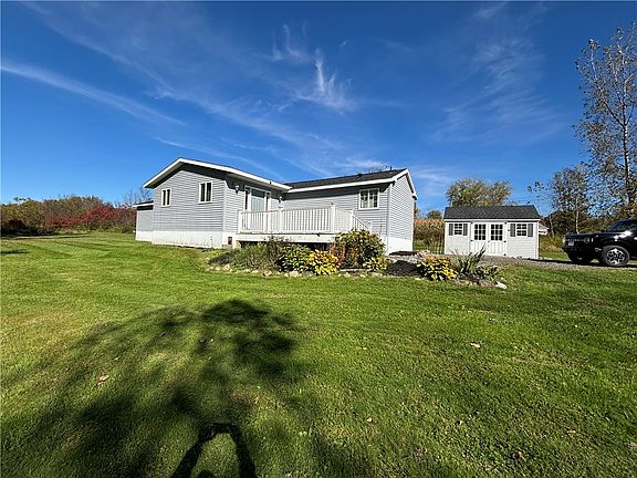 The Ranch style home, situated on over 4 acres of serene countryside, boasts a stone gravel driveway that leads up to its charming exterior. Upon entering through the front door, you are greeted by a spacious dining room or family room adorned with new flooring throughout. The first floor features a convenient laundry room, a well-equipped kitchen with ample cabinet space, a sizable master bedroom offering a luxurious master suite with a soaking tub, stand-up shower, and vanity. Additionally, there is a large living room, two additional bedrooms, and a second full bathroom. The exterior of the home is adorned with vinyl siding, a large front porch deck, and a new $ 7,000 shed. With just a little bit of attention and care, this home has the potential to be transformed into a wonderful place to live. This is a manufactured home.