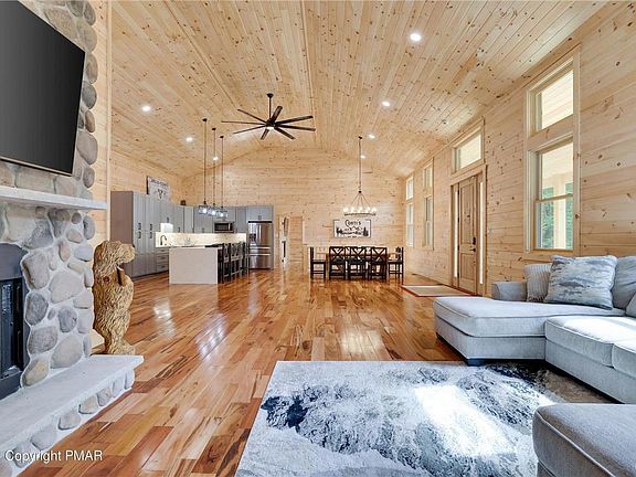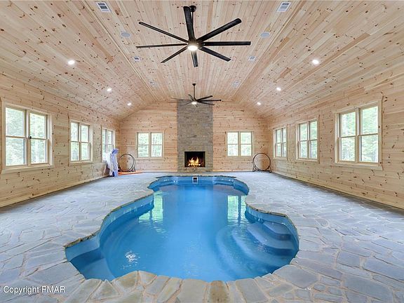 Discover your dream retreat in this stunning new log cabin-style home, blending rustic charm with modern luxuries. Spanning over 5,000 sq. ft.,5 bedrooms, 3.5 custom baths, and a grand great room with tongue-and-groove ceilings, and a stone fireplace. Entertain in the custom kitchen with granite countertops and a formal dining area. The primary bedroom features vaulted ceilings, a double-sided fireplace, and a private bath with a whirlpool tub and walk-in shower. Enjoy the indoor saltwater pool with a slate deck, bar, and family room. The outdoor space includes a covered porch and a custom fire pit on nearly five acres. The oversized two-car garage offers ample storage. Perfect as an investment, this property is zoned for short-term rentals. Luxurious log cabin living awaits!