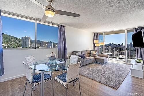 Fabulously renovated corner end unit on a higher floor with a side widow for sweeping views from the mountains to Diamond Head across the city, with ocean, sunrise and sunset views. The most desired stack in the building catching morning sunrises and the cool tradewinds yet buffered from the late afternoon sun. No tall buildings close by so your views are grand and you have a sense of privacy. The best parking stall in the building.
