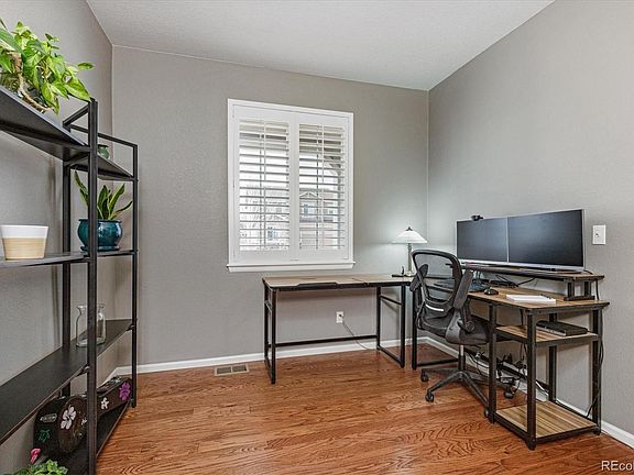 Move in ready Richmond American Fleming boasts 3 bedrooms plus a loft and a main floor study and the desirable sunroom option! Welcome inside to find beautiful plantation shutters and hardwood floors that extend throughout the main level. The open kitchen features maples cabinets with granite countertops and stainless steel appliances that include a brand new gas range and microwave, newer dishwasher and the refrigerator. Bar seating at the island is ideal for enjoying meals and conversations and the oversized pantry has additional storage. You will have plenty of space for entertaining family and friends in the generous great room that boasts a gas fireplace with stacked stone plus ceiling fan and speaker prewire. Enjoy meals in the sunroom with access to the covered east facing patio. Imagine sipping coffee while you appreciate the lot elevation and not having a neighbor directly behind. There is brand new sod at the front yard and in the fully fenced backyard with access gates on both sides and an electric dog fence. Enter the house from the two car garage to find a key drop space just waiting for your personal touch! Main floor is complete with a convenient powder room and flex room that is currently used as an office. Note the wrought iron railings as you ascend the stairs to the upper level loft that can be utilized as a second office, gaming area or exercise space. Primary suite hosts a private bath with large shower, dual sinks and granite countertops and the ample walk-in closet. Secondary bedrooms utilize the full hall bath with laundry close by, washer and dryer are included. Unfinished basement has room to expand. HVAC system includes a specialized filter system and humidifier. Solar will be paid off at closing! Terrain community amenities include the Swim Club Pools (2), Dog Bone Park, Ravenwood and Wrangler Parks with access to regional trails, plus tennis courts, picnic pavilion, playgrounds and a playfield.