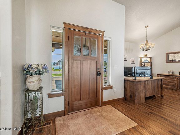 This stunning home offers a perfect blend of rustic charm and modern convenience, featuring Shaker-style cabinets in rustic alder and luxurious live edge granite countertops in a chef's kitchen. The open floor plan is complemented by 9-foot ceilings with cathedral accents in the living area, while the bedrooms boast plush carpet. The property includes a 10x16 garden shed, an irrigated garden space, and front and rear landscaped yards with full irrigation. The insulated garage is equipped with hot/cold water, a whole house hot water recirculation system, and convenient garage door openers with a keypad. Enjoy year-round comfort with a whole house furnace and air conditioning and a covered back patio, perfect for relaxation. Additional features include RV parking behind a fence, two walk-in closets, LVP flooring, and easy access to Hayden, Post Falls, and CDA, all within a welcoming neighborhood.