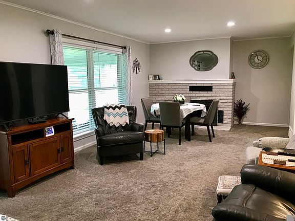 Clare ranch in great location in a popular subdivision just outside of town, Clare City limits is 1/2 mile away. Close to everything Clare has to offer! Blacktop road, concrete driveway. Covered front entry, back three-season room with two lighted ceiling fans for comfort, overlooking fenced back yard, vinyl tinted panels and screens. Everything inside is beautiful and new-looking: kitchen completely redone and has composite flooring which does not get as cold as ceramic per seller, stainless steel appliances, natural gas range for the chef in your life. Living room/dining room combo, natural gas fireplace in dining area. Master has pass-through walk-in closet to nice-sized private bathroom. There is a spare bedroom with beautiful natural wood flooring and double closets. Extra-wide hallway. Bathroom off hallway has double sinks and double mirrors, walk-in shower. Whole basement is open and finish-able with a wood fireplace. Garage has storage room in back, and man door to back patio. House is wired for manual generator. Private well and septic, no water or sewer fees! Nice hardwoods on lot: Oak tree in front, hickory on end. Can't access house from garage, although it's attached. Newer asphalt roof just 3 years ago. Property taxes are currently non-homestead. Home warranty included with full-price offer.