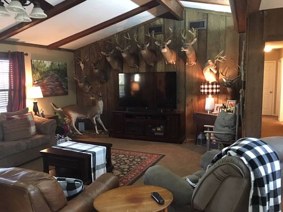 Sportsman's Paradise with over 31 acres of hardwood and pasture with deer and turkey along a creek. This gated property has a large porch and a beautiful view of a branch and two sprawling deer fields. Cooks dream kitchen with a large island, high pantry, and storage galore. Vaulted ceiling and fireplace. Updated bath. A MUST SEE !!!