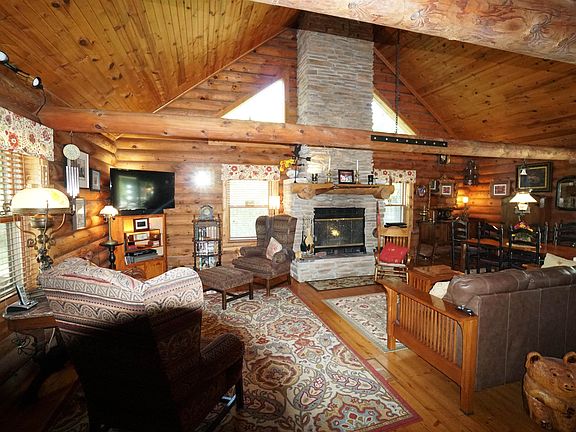 This property is the place to make memories and, if you love the great outdoors, there will be no shortage of them. From hunting large bucks, to camping along the creek and exploring the Muddy Plum creek for river otter, beavers, fish and more! The home has had exceptional care and is obvious when crossing the threshold of the beautiful solid, oak door. The home is constructed with Tennessee white pine pre-treated full, logs. The main living space is a combination of living, dining and kitchen. There is a floor to ceiling wood burning fireplace that not only crates ambiance but warmth. Also on the main floor are two bedrooms and a full bath. On the second level, is a spacious loft area currently used as the master bedroom. Lower level of the home has two walk out doors that lead to a patio and fenced yard. 4th bedroom is located in the lower level and also has a great space for second living area or rec room. Some of the updates that have been completed in recent years are: metal roof, stamped front stoop, garage doors, water softener, furnace and central air. The property is in the forestry program and is an official Tree Farm. Located on a hard surface road and with a flourishing creek and ample trees--these create the perfect country property. **Taxes reflect owner occupied, senior citizen and home improvement.