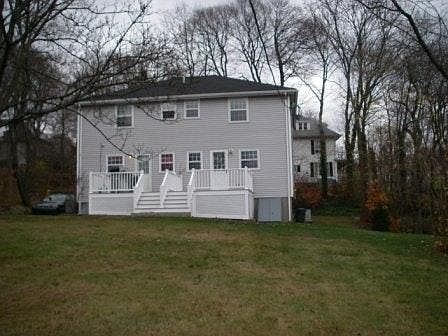 Large modern duplex at end of quiet dead end street, with 2 Levels of living space, large eat-in kitchen with 1.5 Bedrooms and 1.5 tiled baths, wall-to-wall carpeting and linoleum kitchen floor. Clean basement equipped with washer and dryer hookups, attic for storage, central A/C and heated with natural gas. Located within steps of commuter train to Boston on a large private yard with deck and plenty of off-street parking. Previous tenant has left refrigerator, washer and dryer. These are not owner or maintained by the landlord. Owner pays for water, sewer and trash. Tenant pays for gas and electric. Tenant responsible for snow removal. No Pets, No Smoking