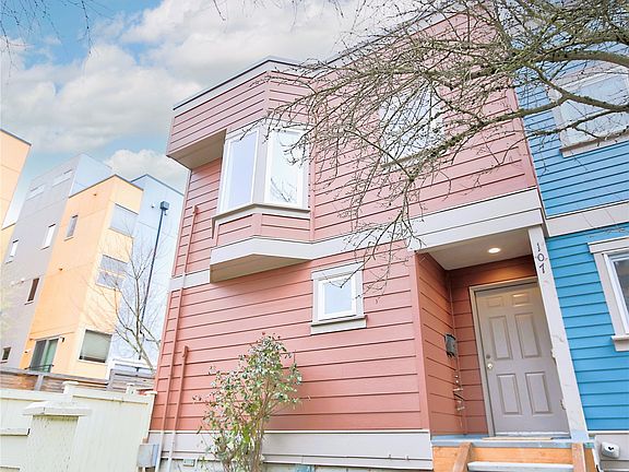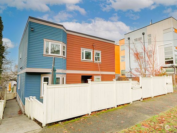 A quiet and convenient townhouse. Tasteful exterior renovation with cement plank siding, new roof, new energy efficient windows and skylight. Interior has a cozy bay window view to downtown and a peek at the Olympics. Enjoy your own fenced yard for gardening, pets or entertaining. Additional new updates include floors, wall heaters, A/C port, and interior paint. In unit washer/dryer stay. Charming Juliet balcony, entry and bath stone floors from British Columbia Two blocks to the First Hill Light Rail, bus stops close by. Near Starbucks, Pratt Fine Arts Center, Yesler Grocery, Nate's & more! Off street parking. A well run association with low dues! No rental cap, pets welcome.