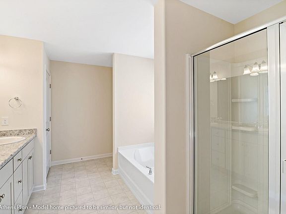 Part of the Georgian Collection, this classic, ranch-style home with split floor plan is a perennial favorite!. The foyer entrance begins at the galley entry hall and has an immediate opening into the kitchen. This kitchen, with cathedral ceiling and beautiful picture window, includes a breakfast area, an excellent working triangle in the kitchen, and a raised bar ledge that separates it from the great room. This great room has soaring ceiling heights and has a wall of windows for natural lighting. This split floor plan offers the additional bedrooms on one side of the home, separated by a full bath, and the master suite on the opposite side of the home. The master suite includes a walk in closet, and a bath with garden tub, separate shower, and double vanities.