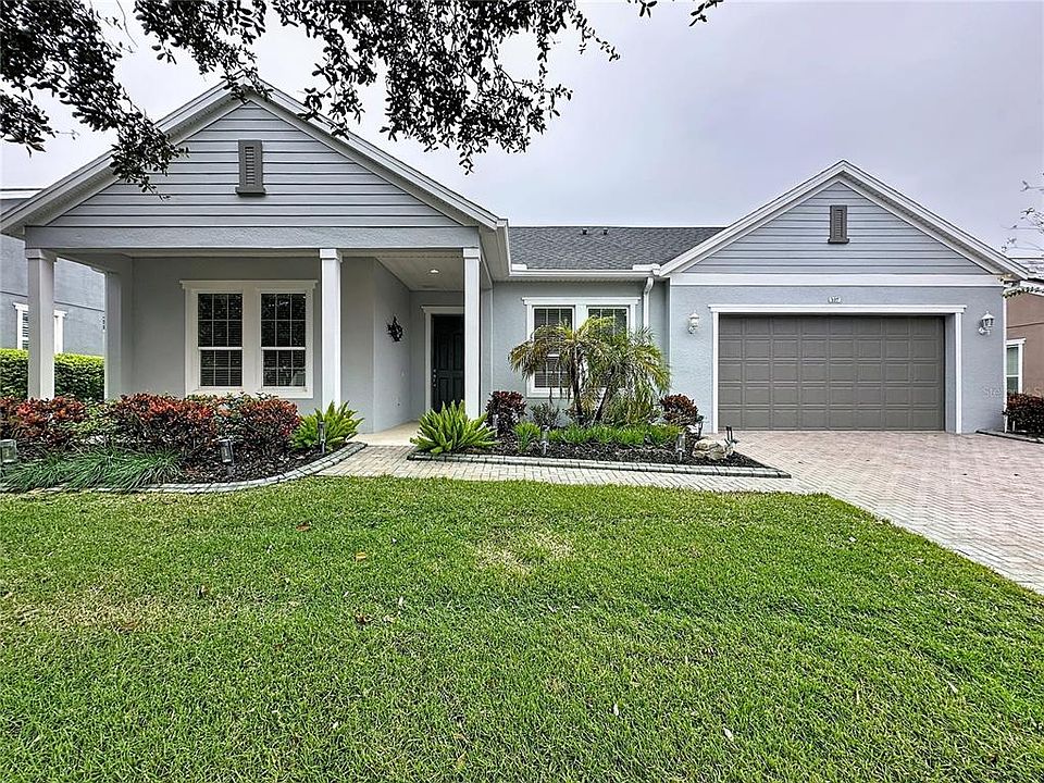 Extraordinary 2,800 SF Luxury Home, All on One Level. Nestled among mature trees with professional landscaping, landscape curbing, and a freshly painted exterior, this home radiates curb appeal from the moment you arrive. A charming front porch and an extended brick-paver driveway and walkway create a warm and inviting entry. Spectacular Outdoor Living & View one of the most coveted views in the community—an unobstructed, breathtaking panorama of the majestic Magnolia House and expansive manicured green space with no rear neighbors. Expanded screened and covered lanai featuring a natural gas fireplace, dedicated gas line, and designer lighting. Second open-air patio with privacy wall—perfect for morning coffee or evening relaxation. Whole-house gutters and screened/vented openings. Elegant Interior with High-End Upgrades. Step through the grand entry and experience a home filled with tasteful upgrades and flowing open spaces. High ceilings, expansive tray ceiling in the living area, crown molding and 5½” wood trim molding. Wood-look tile flooring throughout all living and kitchen spaces. Prewired for surround sound. Energy-Efficient, Cost-Saving Features. This home is equipped with premium enhancements designed for maximum comfort and efficiency: Tesla Full Solar System conveys at no cost, bumper-to-bumper warranty. Dual-pane Low-E windows. Natural gas, tankless water heater. Abundance of 42” solid wood European-style custom cabinets with undermount lighting. Elegant backsplash, soft-close drawers, pot drawers, and hidden trash/recycle pullout. Stainless steel single-basin sink with touch faucet. Built-in dual Advantium ovens, stainless decorative vent hood, and gas cooktop. Walk-in pantry + Butler’s pantry. Whole-house water filtration system. Smart space Laundry & Storage room. Washer/dryer and laundry sink. Bedroom Suites includes Primary Ensuite Retreat. Walk-in shower. Glass shower enclosure, dual vanities, and a relaxing corner soaking tub. Private toilet room with comfort-height fixtures. Linen closet. Two separate walk-in closets with custom built-ins. Ensuite Guest Bedroom. Granite vanity, glass-enclosed soaking tub/shower combo and a Custom Murphy bed. Convenient access to the third full bathroom. Meticulously maintained 5-Ton Trane AC system. Transferable Massey termite bond. Natural gas fireplace. Community Perks: This guard-gated, resort-style community offers more than just a home; it delivers a lifestyle! The HOA covers cable, high-speed internet, security monitoring, and landscaping/ lawn care so you can focus on enjoying your time. At the heart of it all is the spectacular 57,000 sq ft Magnolia House, where you’ll enjoy a Member-exclusive restaurant and bar with live entertainment. Indoor/outdoor heated pools & a state-of-the-art athletic club, Artisan studio, poker room, culinary kitchen, and creative spaces. Sports courts for tennis, pickleball, bocce, billiards & virtual golf,50+ active, member-led clubs for every hobby and interest. A show-stopping Event Center with a stage and professional AV setup. This isn’t just a home, it’s a lifestyle upgrade where you’ll find connection, wellness, excitement, and belonging every day. Conveniently located 45 minutes to Theme Parks, including Universal and Disney World, and Orlando International Airport, 1 ½ hours to Beaches and Port Canaveral Cruise Terminal. This isn’t just a home — it’s a lifestyle upgrade. Live your BEST LIFE at Trilogy!