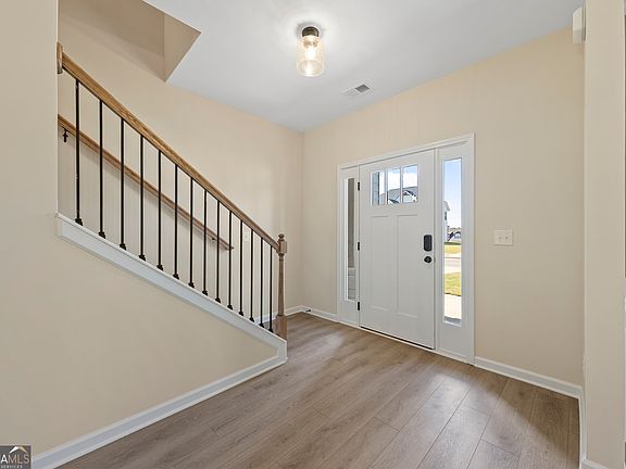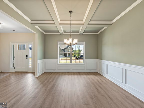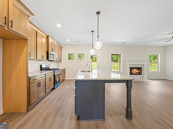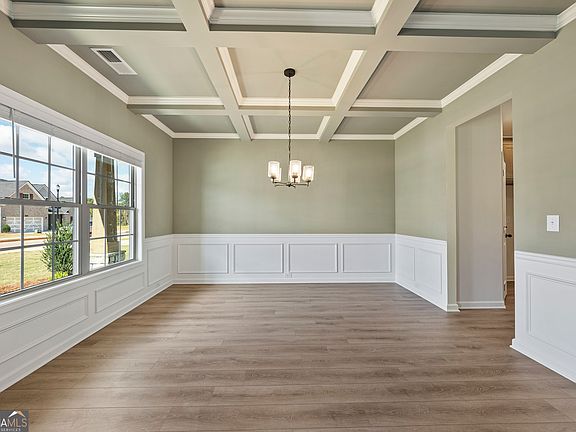 Discover Bryant Lake, a picturesque, tree-lined Hughston Homes community in beautiful LaGrange, Georgia. This sought-after lakefront neighborhood offers the perfect blend of nature and convenience with community sidewalks, tennis courts, a sparkling pool, playground, and clubhouse. Welcome to our Cannaberra B Floorplan, an inviting and open design offering 2,864 sq. ft. of versatile living space with 5 bedrooms and 3 baths. From the moment you step into the light-filled foyer, you'll be captivated by the home's thoughtful details and spacious flow. The formal dining room showcases a coffered ceiling and elegant trim work, setting the stage for memorable gatherings. The great room features a wood-burning fireplace, creating a warm and welcoming centerpiece for everyday living. The kitchen is truly the heart of the home, complete with recessed lighting, abundant, stylish cabinetry, granite countertops, tiled backsplash, and stainless-steel appliances, including a gas range. The center island with sink and integrated dishwasher makes meal prep effortless, while the walk-in pantry provides valuable extra storage. The main level also offers a fifth bedroom and a full bath, perfect for guests. The owner's entry features our Signature Drop Zone with built-in cubbies, keeping your daily essentials neatly organized. Upstairs, the expansive owner's suite serves as a private retreat with a garden tub, tiled shower, quartz countertops, and a huge walk-in closet. Additional bedrooms are spacious and bright, conveniently located near the laundry and hall bath. Enjoy luxury vinyl plank flooring throughout the main living areas and a host of Hughston Homes included features such as a gas tankless water heater, blinds on the front of the home, and a two-car garage. Step outside to the Signature Gameday Patio, complete with a wood-burning fireplace, ceiling fan, and outdoor speakers, the perfect spot to unwind or entertain. Modern convenience meets timeless design with included home automation-keyless entry, video doorbell, automated front porch light, and more!