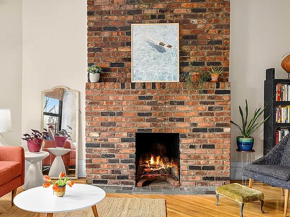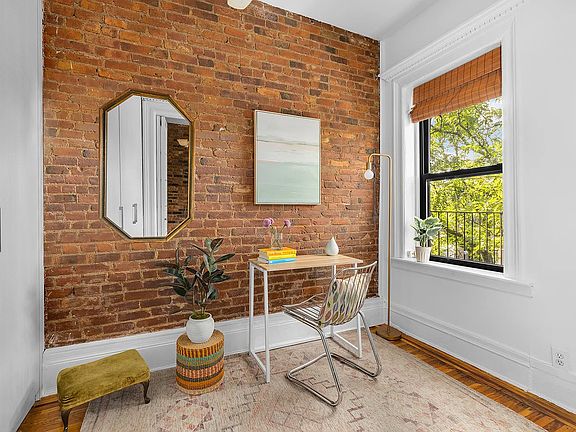 Perched on the top floor of an 8-unit co-op building in prime Park Slope, this southern-facing and sun-drenched 2BR/1BA awaits. Upon entering, you'll be greeted by a small foyer and an open, eat-in kitchen that's connected to a spacious living room with high ceilings, a WORKING FIREPLACE with exposed brick and a unique set of four curving bay windows, that offer treetop views and birdwatching. The sizable kitchen easily accommodates a large dining table and has a dishwasher, window, abundant storage, and plenty of counter space with quartz countertops, real wood soft-close cabinets and a white subway tile backsplash. Off the living room, one bedroom -- that could also be used as an office, nursery or den -- has French doors that allow even more sun to stream in all day, and exposed brick as an accent. It's outfitted with a full wall of custom closets, complete with hanging space, shelving and drawers. A windowed bathroom and larger second bedroom with additional custom closets and room for a Queen bed are situated on the opposite end of the apartment, for increased privacy and quiet. The bedrooms feature ceiling fans and the living room has a gorgeous period chandelier -- all the historic charm of the brownstone block, come to light. The building also includes a lovely, professionally landscaped shared garden, with flowering rose vines and vibrant rhododendron. 107 Berkeley Place is a self-managed and pet-friendly co-op with a laundry room, storage, bike storage, and an extremely low maintenance of just $628 per month. It is located on a quiet and coveted tree-lined Park Slope block with Cafe Regular, a beloved neighborhood cafe, on the corner. Enjoy easy access to the B67 and 69 bus, the Q/B/2/3 trains, the Park Slope Food Coop, Prospect Park, the Barclays Center and Park Slope's many restaurants and shops on 5th and 7th Avenues as well.