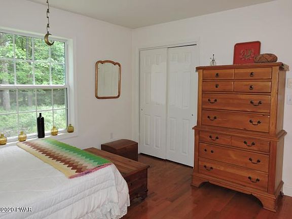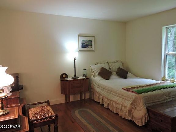 Charming Cape Cod home on 2 lush, landscaped acres. Beautifully maintained & priced to sell. Sip morning coffee on covered front porch or side deck. Experience the serenity. Watch the birds, view the beautiful gardens w/waterfall feature, fruit trees and fields. Gleaming oak hardwood, propane F/P, sun tunnels & recently remodeled bathrooms w/ceramic tile. Open kitchen/dining area, perfect for cooking and entertaining family & friends. Ready to finish lower level w/wood stove, laundry, and 2 car garage. Quality construction, smart floorplan for full-time living or weekend retreat. Enjoy quiet cul-de-sac privacy, minutes from shopping, Route 84, fishing & hiking at Promised Land State Park. In the Heart of the Poconos. Enjoy skiing, waterpark, golf, casinos & more. Taxes only $3,500.