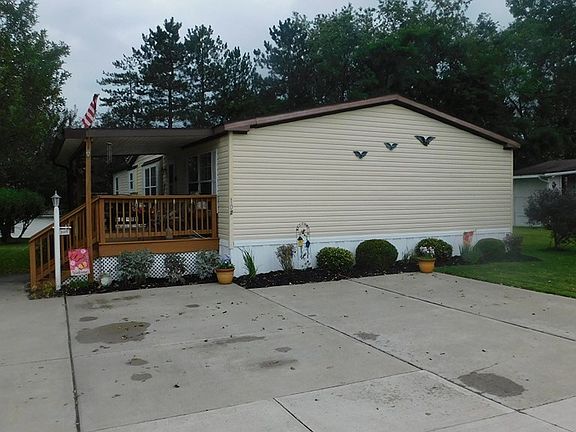 This well-kept home is situated in a 55 and older community park and offers 1568 sq ft of living space. The inside offers an open concept with large living room with gas fireplace, dining room area, central air, large kitchen with island, large pantry, breakfast nook/utility room, 3 bedrooms, 2 baths: including owners en-suite. Outside: A large open deck off the front and side deck, paved driveway, and beautifully landscaped lot with apple and pear tree.