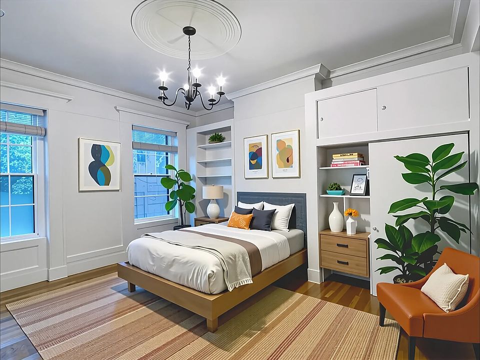 Modern kitchenHardwood floorsGenerous closetStainless steel appliancesThoughtfully designed built-in bookcaseAmple cabinet storageOversized windows