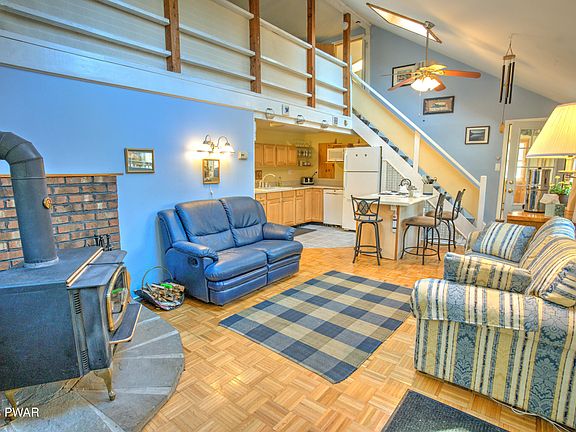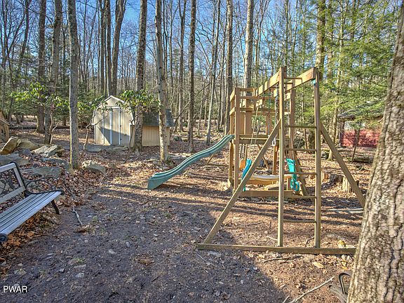 If you're looking for a cozy & comfortable retreat, look no further! This lovely property boasts one bedroom & two baths, as well as two cozy sleeping lofts perfect for accommodating guests. The living room features a wood stove, creating a warm and inviting atmosphere. The spacious kitchen is perfect for whipping up your favorite meals, while the large 3-seasons room offers the perfect place to enjoy your morning coffee or unwind with a good book. Outside, you'll find a large deck, 1 car garage, play area & shed for storing all your outdoor gear. Set in a peaceful and quiet setting, this fully furnished house is the perfect place to escape the hustle of everyday life. Don't miss out on this incredible opportunity! Close to Lake Wallenpaupack. Note: Cash or local bank financing only., Beds Description: 1Bed1st, Baths: 2 Bath Lev 1