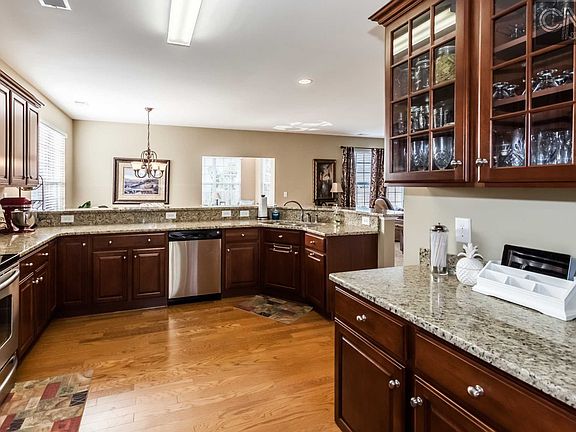 Here s your chance to own the former model home in Heritage Farm! This home has it all! The large kitchen will sell itself with granite countertops, cherry cabinets with crown molding, stainless appliances, hardwood floors and a large bar! The kitchen is open to the spacious family room with a fireplace. A cheery, bright sunroom looks out onto a nice level, fenced backyard and a patio great for grilling. Plenty of room for everyone with 5 bedrooms!! The master bedroom is large with his and hers closets and tray ceilings and private bath with separate shower, granite and tile. Rocky Meadow Elementary is 1/4 mile away! Fabulous pool and amenity center with exercise gym.