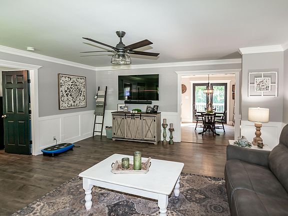 Absolutely charming remodeled 3 bedrooms, 2 bath ranch nestled in this beautifully gated resort community of Lake Royale. This home sits on a large .397 acre wooded and nicely landscaped lot. Inviting covered porch which enters into the very spacious living room trimmed in crown molding with natural light. Large kitchen with lots of cabinet space, recess lighting, elegant pendant lights and gorgeous ship lap design. Master bedroom with large walk-in closet. Master bath consists of double sink vanity. Ceiling fans throughout home. Large deck, chain link fenced yard, fire pit and huge shed for extra storage. 3-year-old roof with warranty. This home is convenient to the lake, community pool, clubhouse, tennis, golf, beach area and community restaurant. Jet skis, boating and fishing are allowed. Book your appointment today!