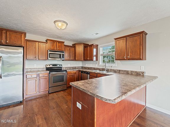 Split floor plan home minutes to everything. This three bedroom home has over 1,500hsf with the master bedroom on one side of the home and the other two bedrooms on the other side. Stepping inside the home you walk straight into the huge living room with a vaulted ceiling and a fireplace. Around the corner is the formal dining room that is open to the huge kitchen. The kitchen has tons of cabinets and counter space and even a peninsula on the kitchen counters that is perfect for bar stools. All of the stainless steel appliances even stay. The master suite is off the living room on right side of the home and has a trey ceiling, huge walk in closet, and even it's own private bathroom. The master bathroom has a double vanity, soaking tub, and a stand up shower with a shower door. You'll notice the tile floor in the bathrooms and the tile that outlines the tub and the shower, not something you see in every home. The other two bedrooms are on the opposite side of the home with each having plenty of space and a full guest bathroom for them to share. The back yard is completely fenced in and even has a patio area that is perfect for those barbeques. This home is nestled between Jacksonville and Richlands which makes it convenient for all shopping and access to bases. Schedule your private tour today!!