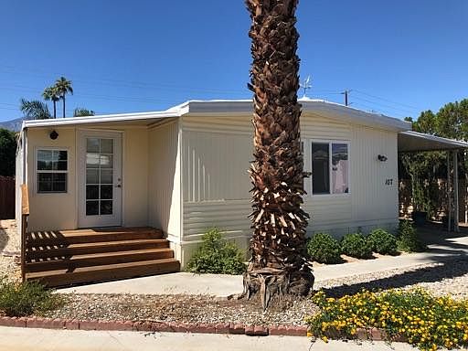 MUST SEE! Condo quality renovation of this large One Bedroom One Bath Mobile Home with an incredibly large outdoor backyard with Desert Landscaping and a stunning view of Mount San Jacinto. Great place for your furry relatives to romp around and play without worry. This lovely home has a newer custom kitchen with Dishwasher and a Garbage Disposal. Typically unheard of in mobile homes. The decor of this home is reminiscent of 50's Modern with the use of vivid colors and flow of the design. Besides the large Kitchen, it boast a Living Room with Dining ''L'' and then the large bedroom with bath. The home includes A/C and a Swamp Cooler. The ''surprise'' sun porch is about 40 feet long and even has a bar at one end. Outside this great ''gathering'' room is the wood deck overlooking the tremendous backyard, with seating area, fire pit and glorious views. The covered carport and driveway can hold up to 3 cars and there is a storage shed too. The community pool and spa and club house are great too!
