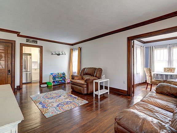 This delightful home stands out with its distinctive basketweave brick exterior and timeless appeal. Inside you'll find hardwood floors throughout the main level, including a spacious living room. The charming dining room features the original light fixture and is filled with natural light. The kitchen may be compact, but it's full of character and functionality-complete with gorgeous finishes and all appliances included. Upstairs, the full bathroom boasts dual sinks and a beautifully tiled shower. The master bedroom offers double closets for ample storage. Enjoy outdoor living in the large, privacy-fenced backyard with a cozy patio. A detached one-car garage adds convenience and extra storage. Convenient location - Just blocks from the hospital and schools. Don't miss the chance to own this unique home with a perfect blend of vintage charm and modern updates!