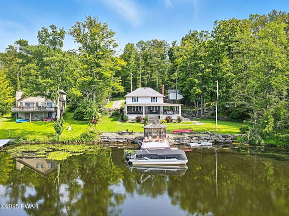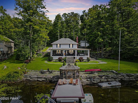 AMAZING LAKE HENRY LAKEFRONT HOME - Lake Henry is a pristine 310-acre private, quiet powerboating lake in the Lake Region of the Northern Poconos, where only lakefront owners enjoy direct access. This extraordinary 1925 classic has been masterfully renovated, preserving its timeless elegance while adding every modern luxury, exuding the glamour of The Great Gatsby. With 4 spacious bedrooms, 4 beautifully updated baths, and breathtaking lake views from nearly every room, this home is a rare treasure.The main level impresses with an airy open layout, rich new flooring, a stunning native stone fireplace, a gourmet granite and stainless-steel kitchen, large dining area, inviting living room, stylish half bath, and versatile family room. Step outside to a spectacular wrap-around covered porch with an outdoor granite kitchen boasting stainless BBQ, separate grill, abundant cabinetry, and storage beneath -- perfect for entertaining.Upstairs, find 4 generously sized bedrooms, including a serene primary suite with panoramic lake views, connected closets, and abundant storage. One bedroom showcases a private sink, a nod to the home's 1925 charm. The walk-out lower level serves as a 5th bedroom or recreation space and features an oversized laundry area with ample countertop space and a second refrigerator, plus additional unfinished storage.The grounds are a masterpiece of hardscaping with a stone pathway leading to a charming lakeside gazebo, private dock, and two firepits -- one propane and one wood-burning -- perfect for lakeside gatherings. A whimsical shed offers potential as a playhouse or ''she shed.'' Additional highlights include central A/C, a new propane heating system, and a generator for peace of mind. Meticulous updates make this historic lakefront beauty a move-in-ready masterpiece.