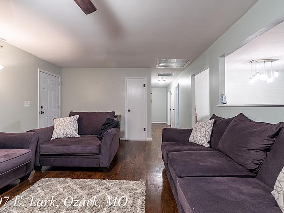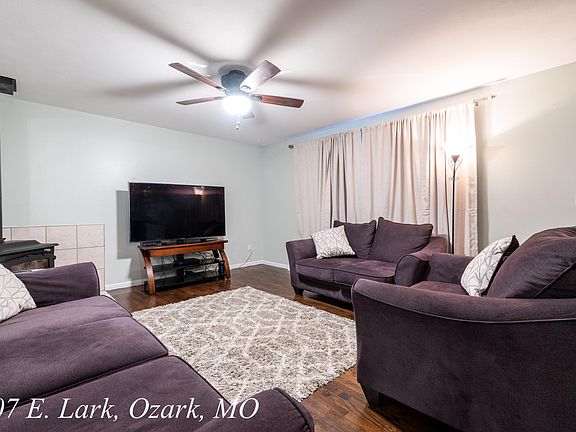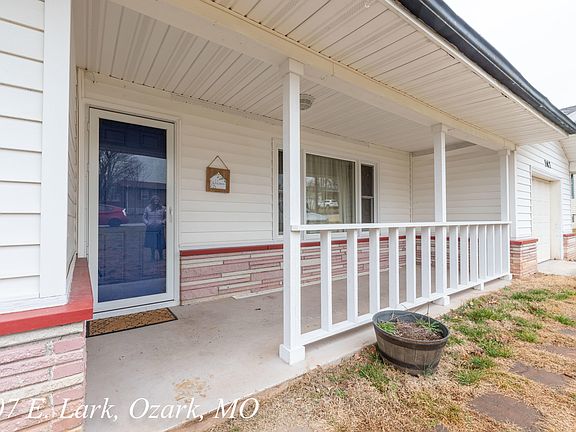107 E Lark St, Ozark, MO 65721. Updated home on large lot that backs up to a creek! Hardwoods in the home have been restored. Soft-close custom cabinetry and composite sink in the kitchen. Spacious dining area. Wood burning stove to keep you cozy and warm. Partially finished basement. The garage is extra-deep. Close to shopping, restaurants, and medical facilities. Ozark schools!