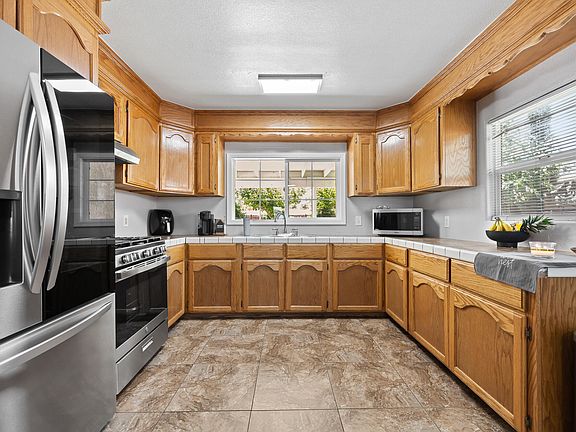 Step into comfort and style with this beautifully maintained home featuring a welcoming open floor plan and gorgeous tile flooring throughout. The cozy fireplace brings a warmth atmosphere, making the living area perfect for relaxing evenings or gatherings. The kitchen is a chef's delight with stainless steel appliances, plenty of cabinets, and generous counter space. You'll love the spacious bedrooms, indoor laundry, and convenient covered parking. Outside, the backyard is a true oasis—beautifully landscaped with a variety of fruit trees, a dedicated gardening area, and two storage sheds. Enjoy the large covered patio, ideal for entertaining or simply unwinding outdoors. This home has it all comfort, functionality, and outdoor charm. Don't miss out!