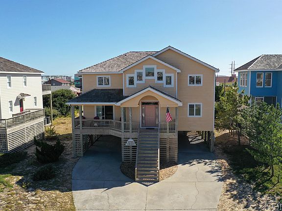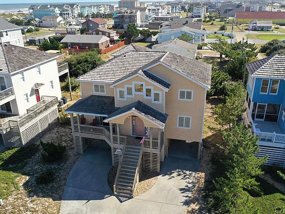 Just minutes away from the ocean access this beautiful well kept secret is located in the Village at Nags Head. Located in the subdivision of Oceanwatch and offering the best of both worlds with ocean to sound views. Pull under, park and enter at the dry entry on ground level. The storage rooms and owner's closets are conveniently located to drop your beach supplies before heading upstairs. Next level there are three lovely bedrooms and one a glorious ensuite. The kids will enjoy the bunk room and most likely stay up all night. Also two more bedrooms with queen size beds that access to the decks offering a hot tub and upper decks for viewing the sunrise or moonrise and the stars. The ensuite offers access to the comfy deck to go out for a soak in the hot tub too. Ensuite has a comfortable space with walk in closet and offers a a great bath with full shower/tub combination. Get cozy in the den off the bedrooms to read a book or watch a movie or put puzzles together. Upstairs one large open living with beautiful windows which bring great light into the large room. Step up to the scenic ships watch to see the ocean and sound views and also offering spectacular sunrises and sunsets. Kitchen is tucked in by the dining room and offers everything the cook will need to entertain. Ensuite is bright and airy upstairs. It also offers a luxurious bath with custom tiled shower and jacuzzi bath for your enjoyment. Village at Nags Head is a Ocean to Sound community with access to the beach and the sound. The home has been rented only Memorial to Labor Day and owners have enjoyed off season for their own family. Oceanwatch community pool is right across the street.