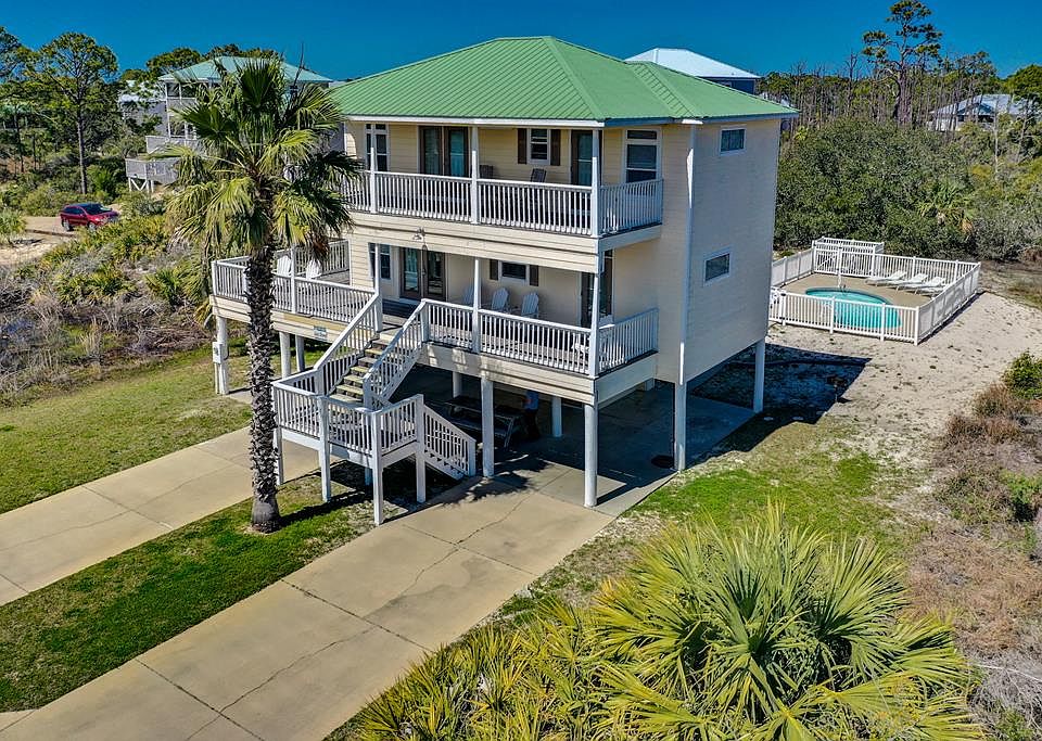 Gulf View 3 bedroom, 3 bath home with a private in ground, heated pool with deeded beach access on a quiet cul-de-sac in San Blas Plantation! Hardwood floors, stainless steel appliances, 2 levels of covered porches, and a sundeck. Queen bedroom with en suite bath on the main level, Master and an additional oversized bedroom on the top level both have en suite baths. Plenty of parking for friends and family! Stunning views are sure to leave you wanting more in this beautiful Gulf View home! Be sure to check out the virtual tour!