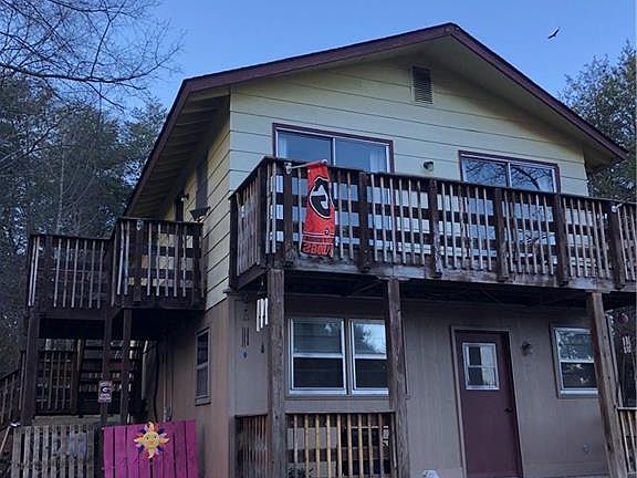Looking for a unique lake property, look no further. This cute home has two bedrooms and a full bath downstairs with a living area. Go upstairs by way of side door and up the side stairs to the other two bedrooms, full bath, kitchen/dining room and living room. Upstairs bathroom has new fixtures. Fireplace is located in the upstairs living area. You can enjoy your evening on the front balcony. The lot next door is also included in the price making the total acreage .54. Owner has partially cleaned side lot. Around back you can sit around the firepit or grill on the covered area recently built.